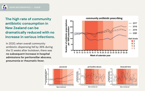 When overall community antibiotic dispensing fell by 36% during the 12 weeks after lockdown in 2020 there was no subsequent increase in hospital admissions for peritonsillar abscess, pneumonia or rheumatic fever.